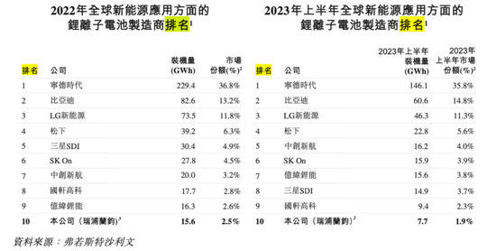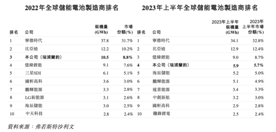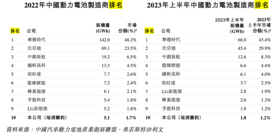 2022年、2023年上半年,瑞浦兰钧在全球储能电池装机量排行榜中,排名从第三名滑落至第四,市场份额从8.8%下滑至5.7%,行业第三的位子被亿纬锂能(维权)取而代之;在中国动力电池装机量均排名第十,市场份额则从1.7%跌至1.2%;在全球锂离子电池制造商中排名第十,市占率由2.5%下滑至1.9%。
