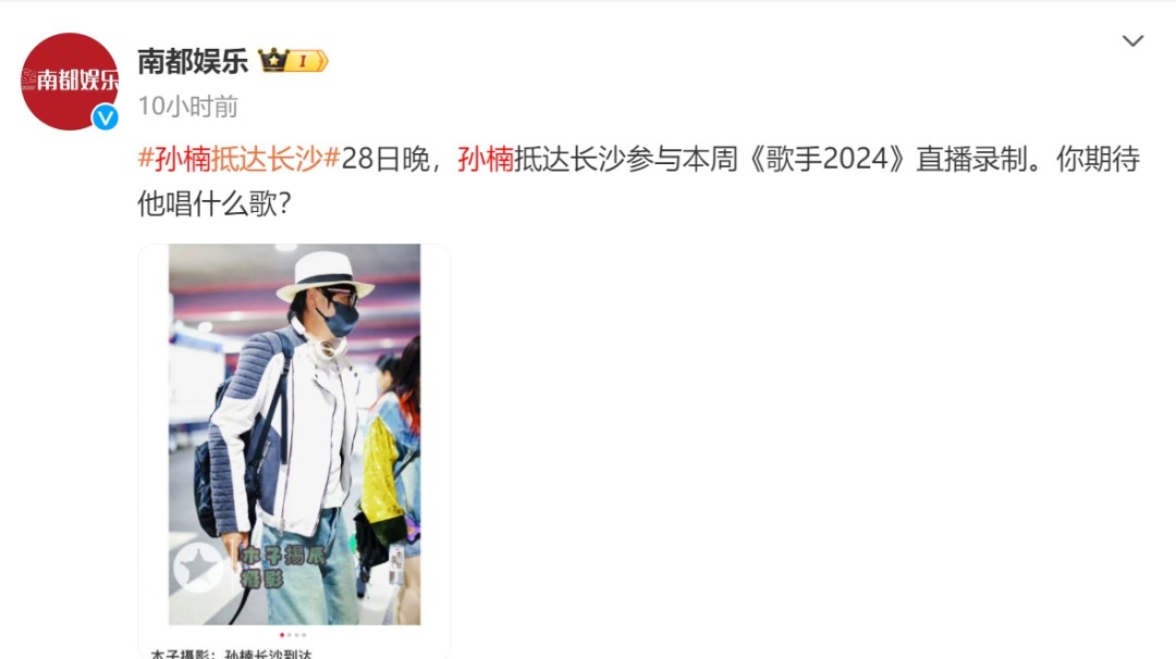 今天,孙楠抵达长沙,为本周五《歌手2024》直播准备。