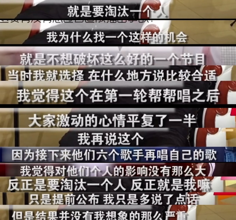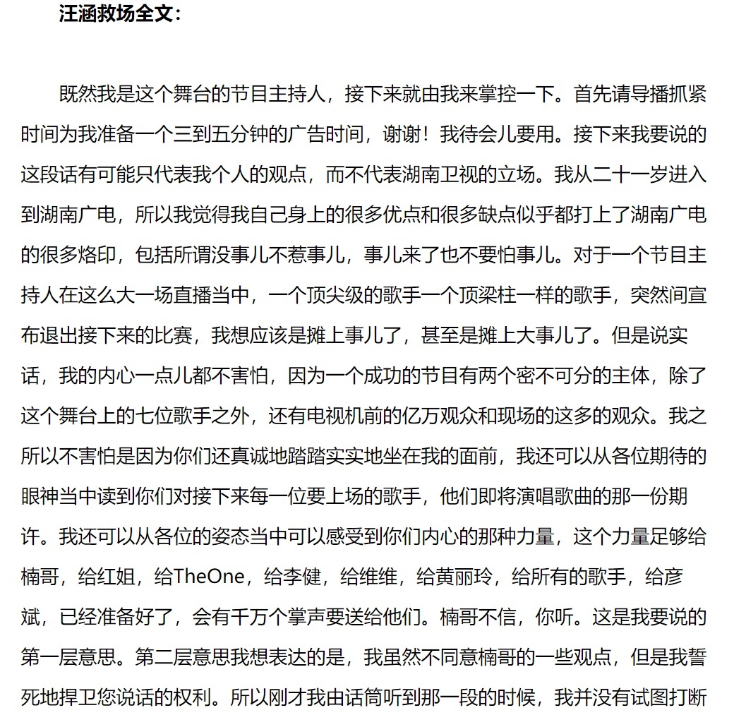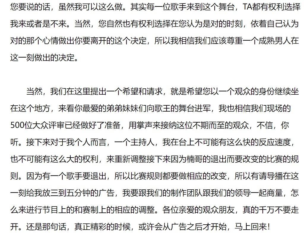 接着说自己二十一岁进入湖南广电以来,身上有许多湖南广电的烙印,知道事儿来了也不要害怕。在这么大型的直播中,遇到顶尖、顶梁柱歌手退赛,感觉摊上大事了,但他内心不害怕.......