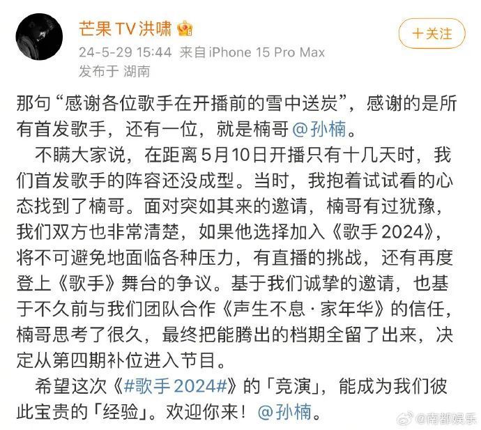 今天下午,《歌手2024》导演洪啸发文锤了孙楠就是补位歌手。