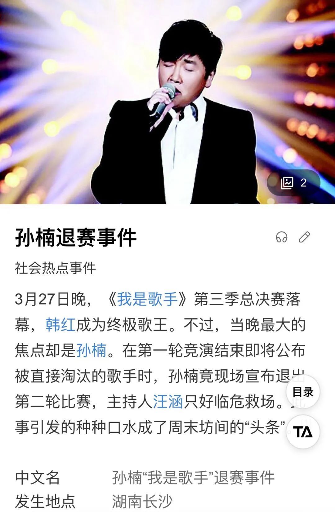 针对孙楠退赛事件,当时的总导演洪涛很给孙楠面子,很体面地表示孙楠第一轮是第四名,能进入下一轮的。
